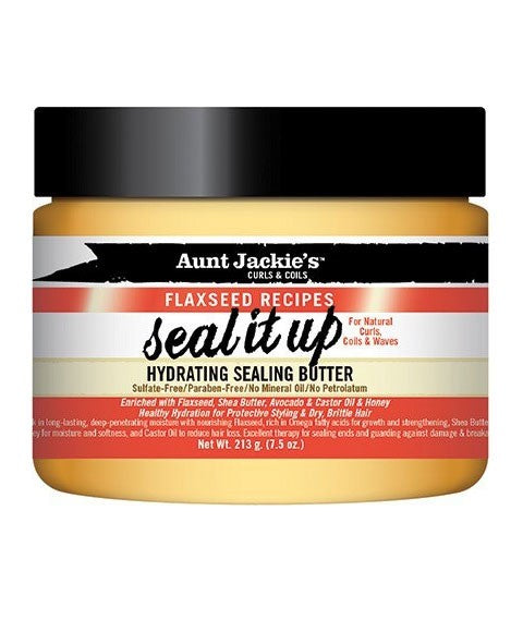 Aunt Jackies ultimate moisture therapy, Seal It Up delivers long lasting hydration, helps prevent split ends, strengthens and hydrates damaged ends. Flaxseed, rich in Omega fatty acids, together with Honey, Avocado and Shea Butter, helps to prevent shedding and thinning, while softening, shining and protecting hair from breakage. Its not just for ends! Use Seal It Up to lock in moisture all over hair. Excellent moisture remedy for 3a-4c hair types, protective styling, caring for hair under wigs, weaves and braids, and any hair textures in need of oil-based moisture therapy.